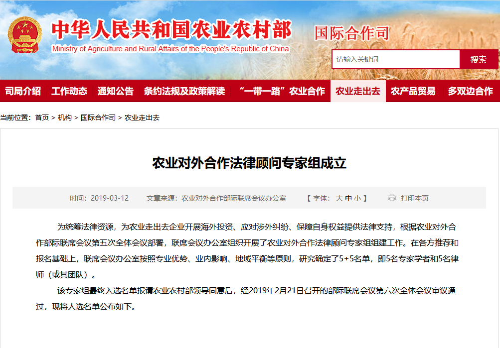 3月12日,中国农业农村部官方网站公布了农业对外合作法律顾问专家组成立的消息。农业农村部在各方推荐和报名基础上,按照专业优势、业内影响、地域平衡等原则,确定了5+5名单,即5名专家学者和5名律师(或其团队),公司伟德体育祝宁波副教授被聘为专家组成员之一。