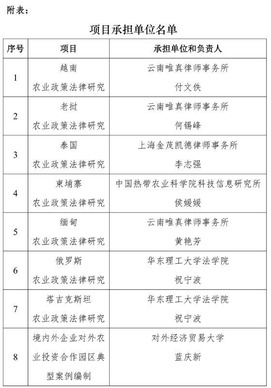 4月16日,中国农业农村部对外经济合作中心官网发布了《关于国别农业政策法律研究和境内外企业对外农业投资合作园区典型案例编制承担单位评审结果的公告》。