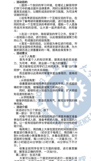 为了让同学们更好的将精力投入到专业学习中去,同时为了配合公司公司提倡的“三走”活动,法学152班的班团干部在收集、整合、分析同学们发展房向的基础上有针对性的制定了涵盖集体自习、知识交流分享在内的多种班级制度建设活动,从整体上营造了良好的学习氛围,带动了整体的学习风气。