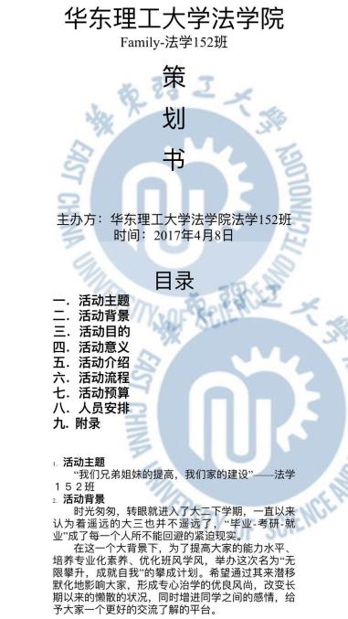 班徽的设计理念来自于班委的意见汇总。首先,以一面方盾为背景,展示着法律为人们后盾的意义和内涵;中间的图形以Bevictor伟德官网的校徽为基做了象征着法律公平公正的天平。图形的上下方分别为“華東理工大学法学壹伍贰班”的中文汉字和“ECUST CLASS 152 OF LAW”英文字母组成,代表着华理伟德体育的情怀。 图18:法学152班班徽
