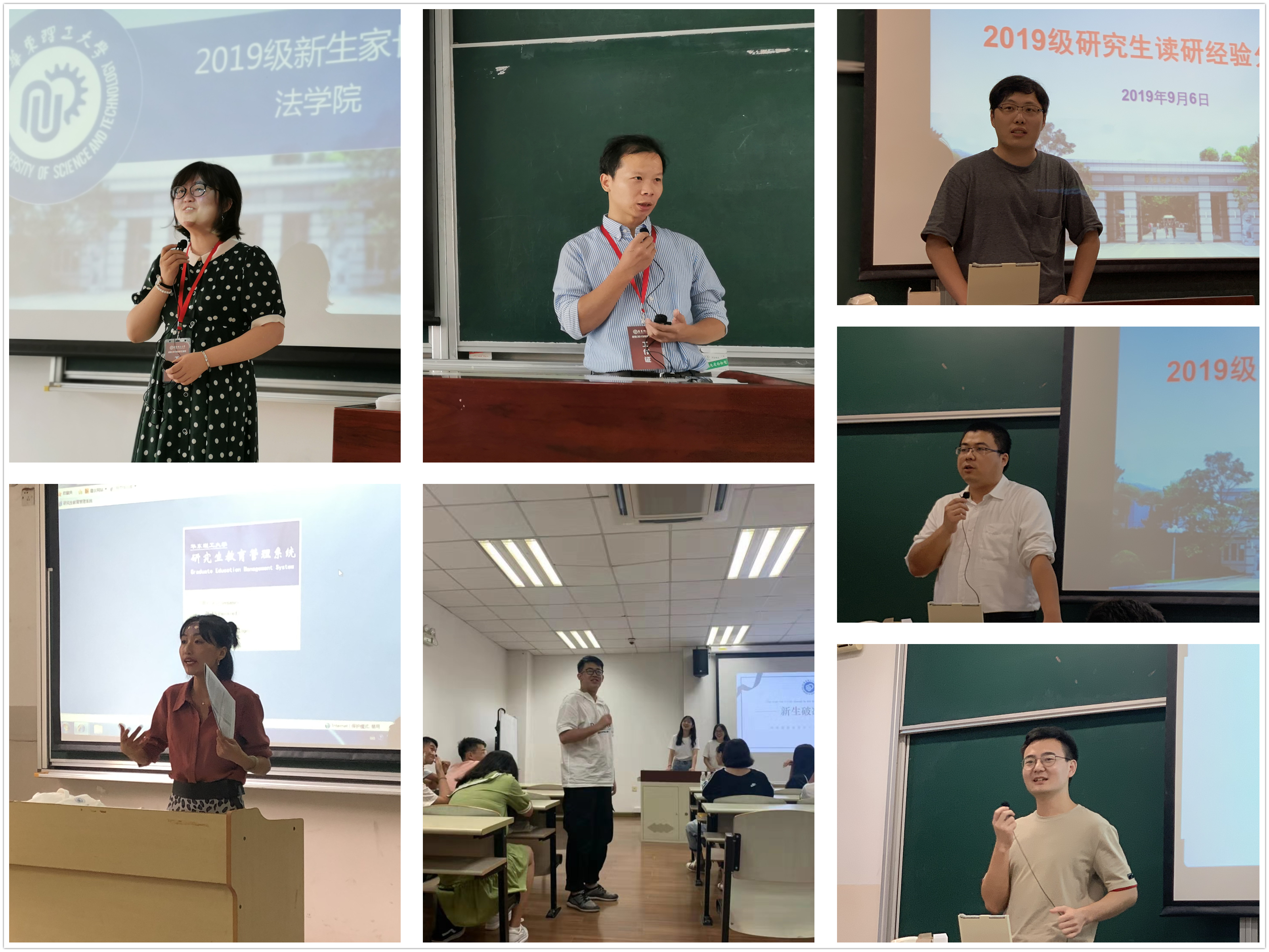 分别召开本科和研究生新生年级大会,李思杭、邵雪倩、童友美组织新生学习本科生相关管理制度、研究生手册、培养方案,现场指导新生选课。本科生还组织了破冰活动,新生们通过自我介绍、才艺展示、趣味游戏等环节拉近了彼此的距离。周建国围绕读研的初心、当前研究生的学习现状与问题、读研的目标以及如何实现目标四个方面对新生开展入学教育,希望同学们常怀好奇心和求知欲,培养自省能力和容错能力。公司邀请优秀青年教师韩康、2017级优秀研究生代表张旭东、戴峻为新生分享读研经验。韩康对新生提出了研究生阶段规划的建议,张旭东、戴峻分别从如何进行学术科研和法员工的职业规划与实习交流两方面分享了经验。