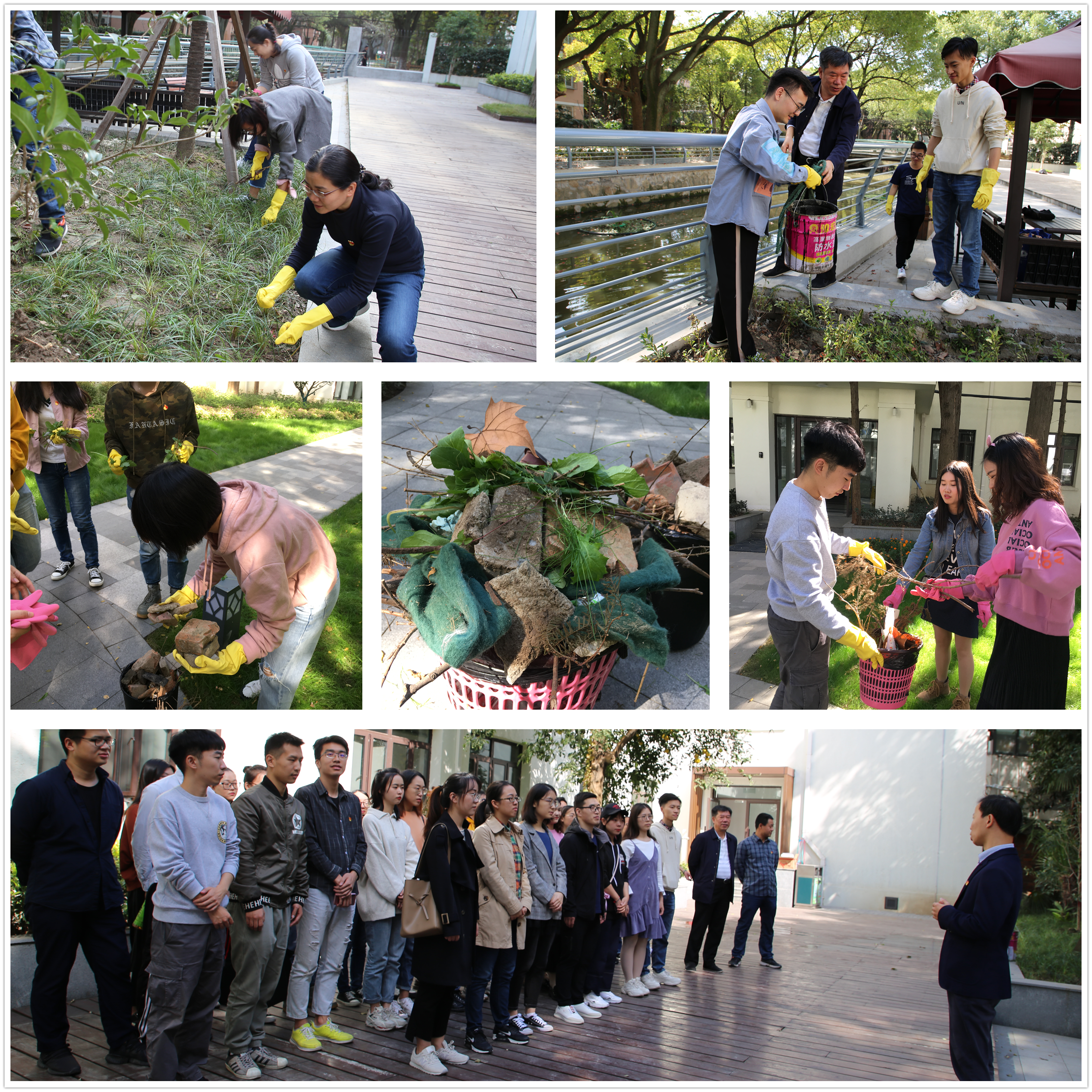 中午时分,所有人员在团结三楼庭院集合列队,公司党委副书记周建国介绍了劳动任务和分组情况。分发劳动工具后,各组组长带领大家热火朝天地干了起来,捡拾有火灾隐患的干树枝,拔除绿色植被中的杂草,清理庭院中的卫生死角等。在大家的共同努力打扫之后,团结三楼、四楼庭院变得美丽整洁,改善了师生的学习生活环境。