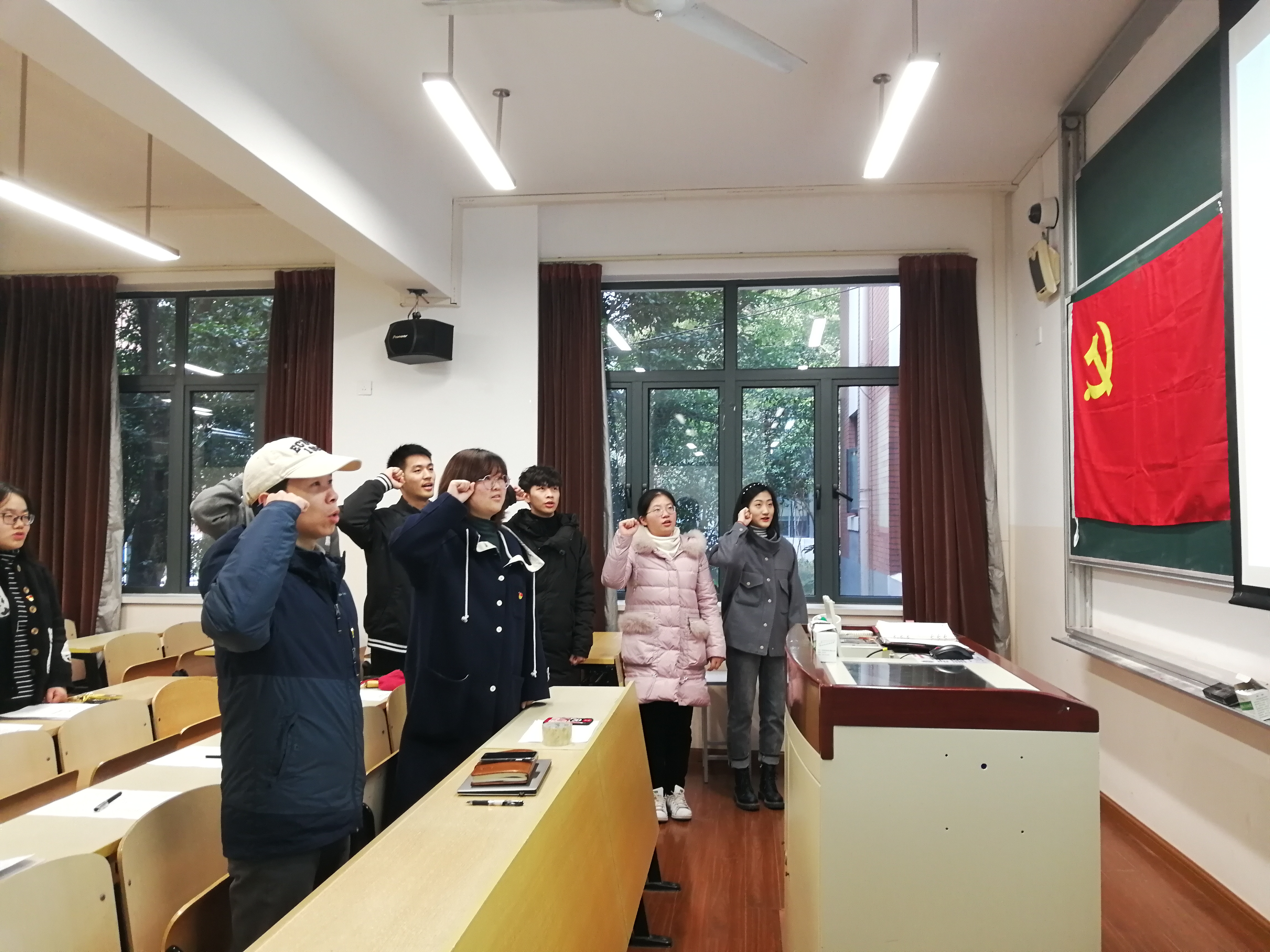 会议伊始,由新审批入党的五位预备党员陶奕源、武建功、彭仕杰、高子涵、樊竹沁进行入党宣誓。在李思杭的带领下,支部其余成员同五位预备党员一起面对党旗庄严宣誓。紧接着,支部成员一同回顾了中国共产党入党誓词从建党时期至改革开放时期的历史沿革,体悟党与时俱进的先进性,重温入党初心和使命,从而切实将入党誓词烙在心里,落在实处。