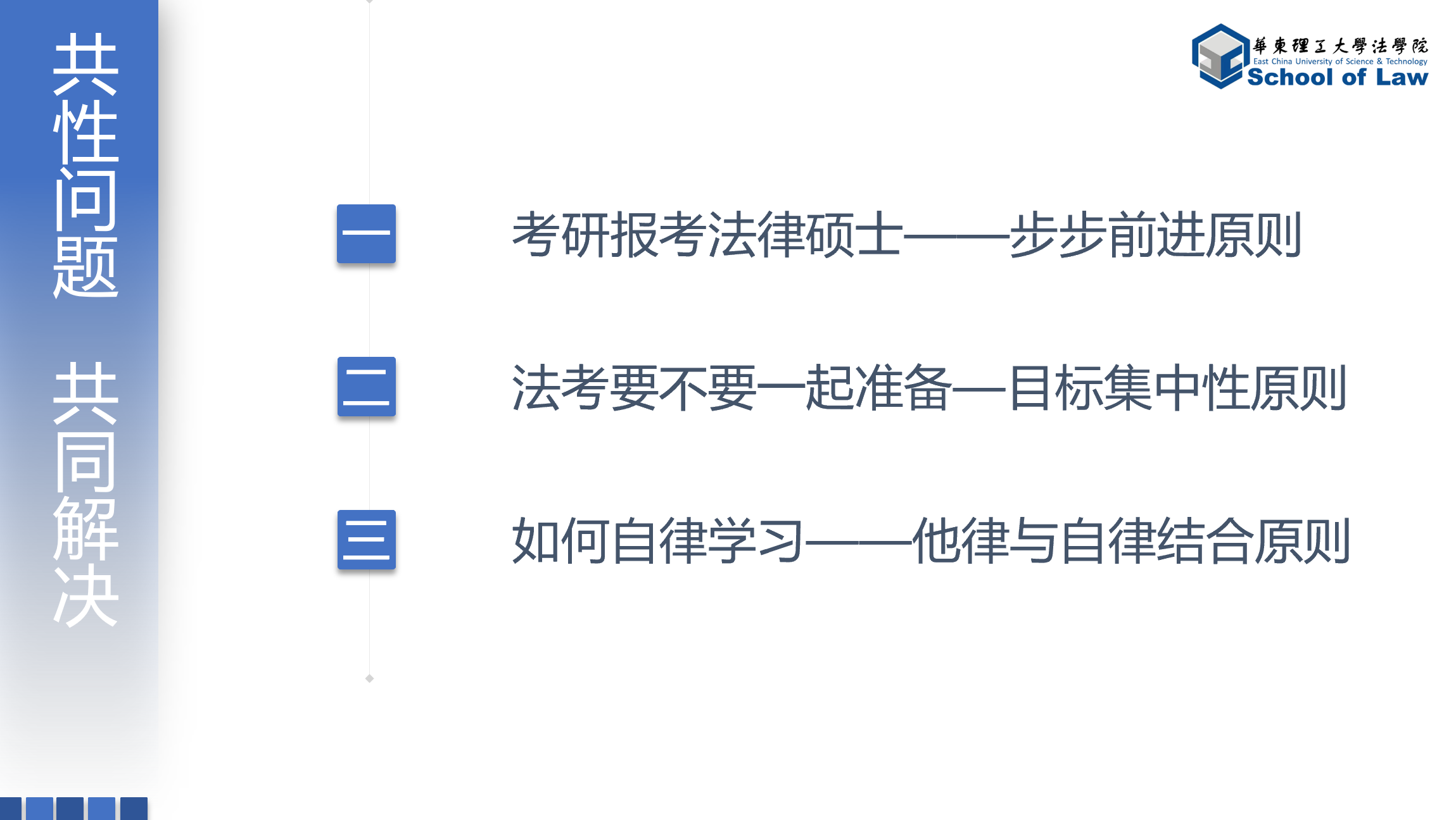最后,张婧针对同学们本学期的本科课程学习情况进行了叮嘱,希望同学们协调好本科课程学习与考研、法考复习的矛盾点,将本科学习与考研或法考相结合,不可顾此失彼、彼此分立。
