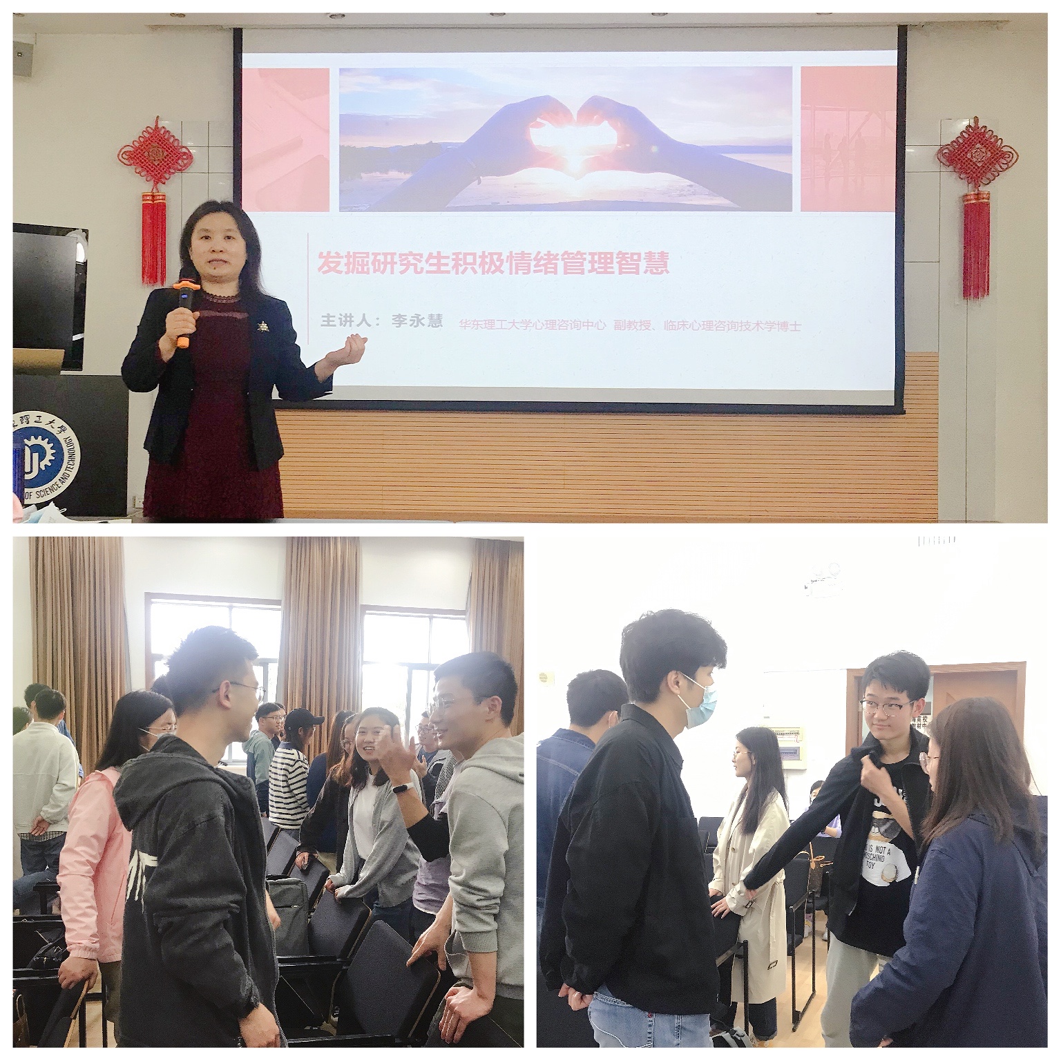 4月23日,伟德体育在徐汇校区图书馆201举办“发掘研究生积极情绪管理智慧”心理调适主题讲座。本次讲座由公司心理咨询中心副主任、华东师范大学临床心理咨询技术学博士李永慧副教授主讲。近百名研究生踊跃参与。