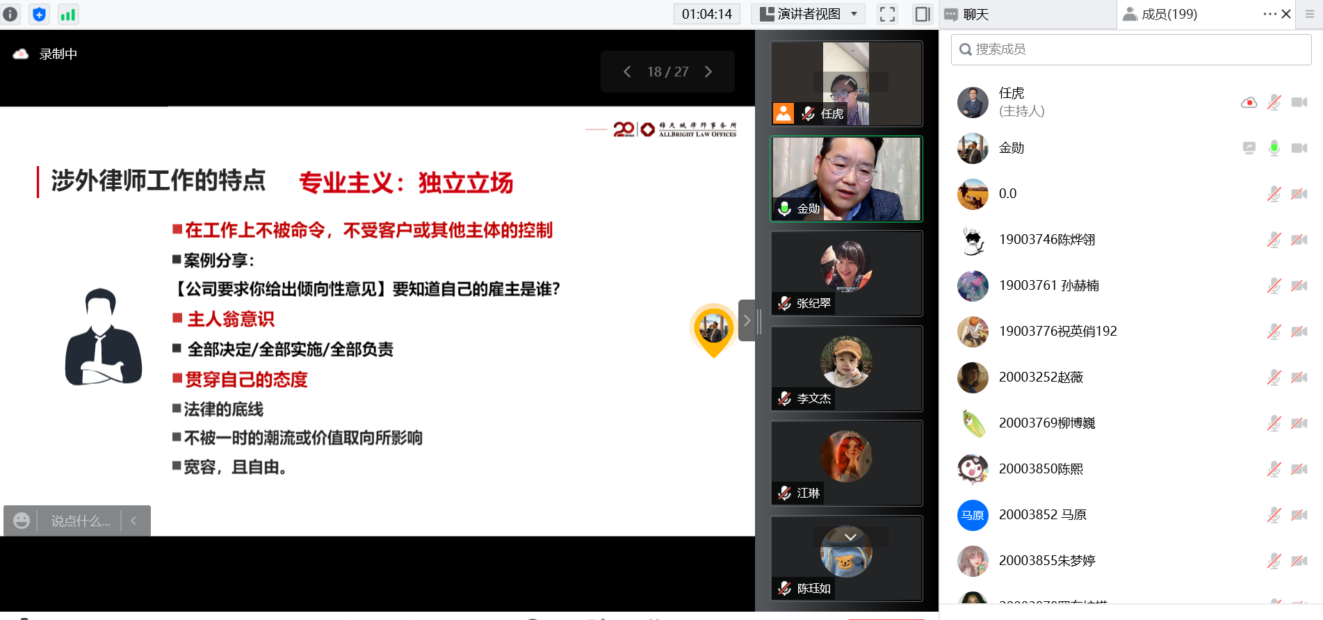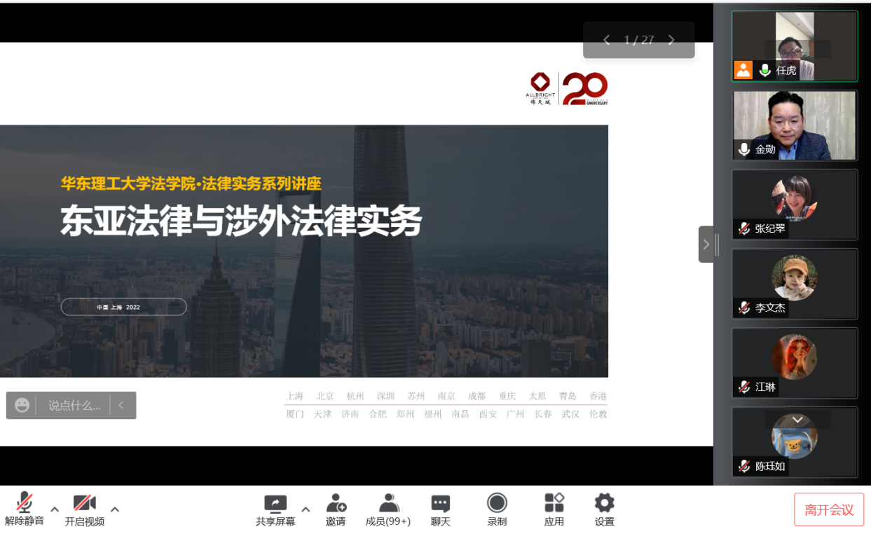 为加深员工对东亚法律制度的了解,提升涉外法律实务技能,4月28日晚,伟德体育举行法律实务讲座“东亚法律与涉外法律事务”。本次讲座邀请了上海市锦天城律师事务所高级合伙人金勋律师主讲。讲座由任虎副教授主持,东亚法制研究中心的李龙老师参与会谈。200余名研究生与本科生一同在线聆听。