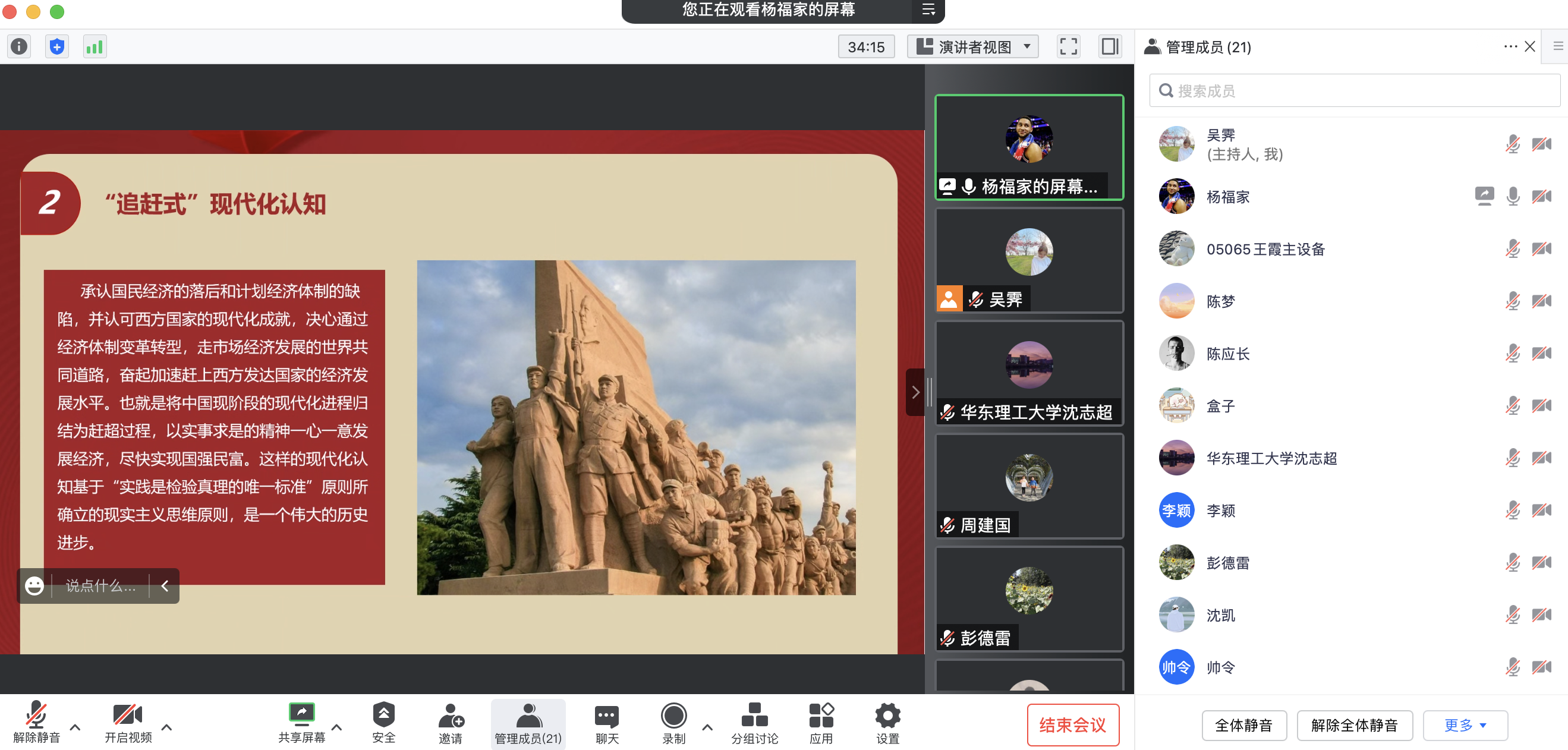 首先,吴霁介绍了党的二十大的主题、主要议程以及大会对我国当前社会发展的重要作用,随后由杨福家等七位同学发表主题演讲,分享自己的学习心得,其中既有对大会提出的新理念的详细解读,如中国式现代化、全过程人民民主、“五个必由之路”、三个“第一”等,也有以冬奥会等热点和时政问题为引,对我国的文化自信与自强、“一国两制”制度、人类命运共同体等传统议题进行的深入分析。其他同志也分享了学习党的二十大精神的心得感悟,表示作为当代青年要认真学习贯彻党的二十大精神,始终牢记习近平总书记的嘱托,怀抱梦想、脚踏实地,为国家的发展添砖加瓦,不负党和人民的殷切期望。分享完毕后,同学们还一一介绍了各自的毕业论文进度与就业情况。