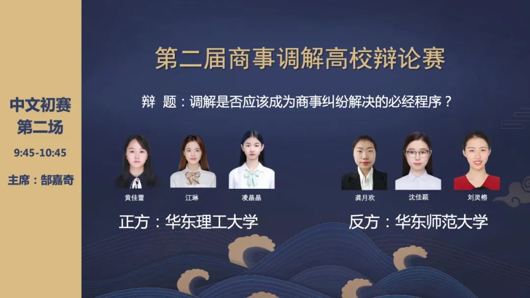 作为上海市法学会东方法学商事调解大赛系列赛事之一,第二届商事调解高校辩论赛于11月6日开赛,分为初赛、复赛、半决赛与决赛4个阶段。复旦大学、上海交通大学、同济大学、华东师范大学、华东政法大学、Bevictor伟德官网、上海师范大学、上海外国语大学、东华大学等14所沪上知名高校的20支队伍参赛。其中中文赛赛队共14支,英文赛共6支。比赛全程通过哔哩哔哩等平台直播。