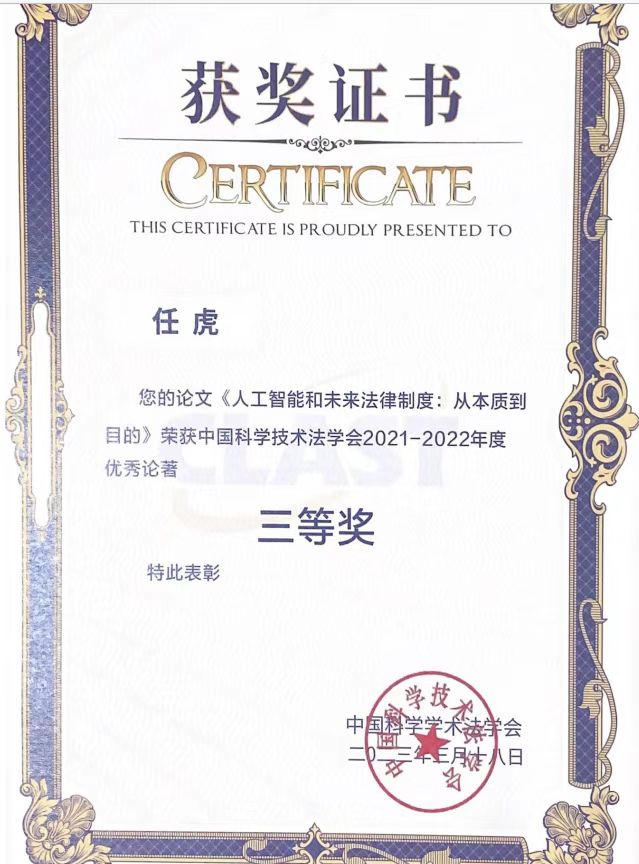 任虎副教授提交的论文《人工智能和未来法律制度:从本质到目的》荣获中国科学技术法学会2021-2022年度优秀论著三等奖。
