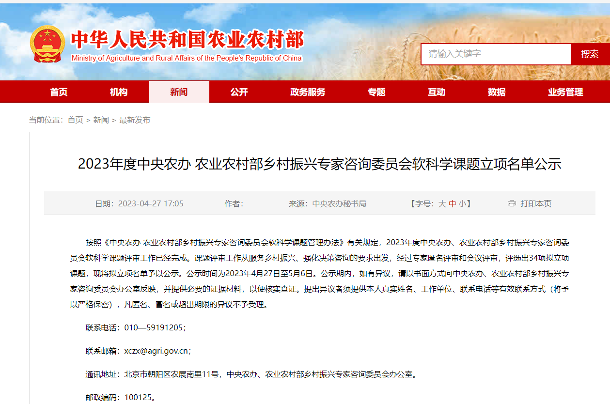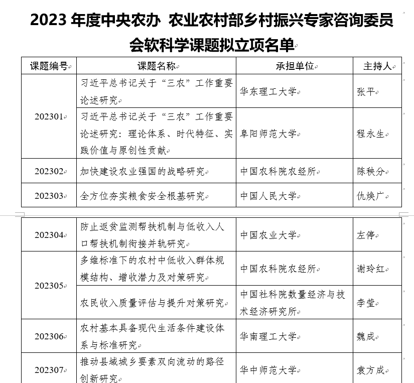 日前,2023年度中央农办、农业农村部乡村振兴专家咨询委员会软科学课题立项名单公布,公司张平教授主持申报的课题“习近平总书记关于‘三农’工作重要论述研究”获得立项。