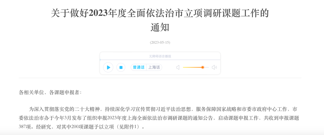 上海市委依法治市办以习近平新时代中国特色社会主义思想为指导,全面贯彻落实党的二十大精神,深入学习贯彻习近平法治思想,为更好使法治成为城市软实力和核心竞争力的重要标志,建设更高水平的法治上海,全面围绕市委市政府中心工作,设置2023年度依法治市调研课题。