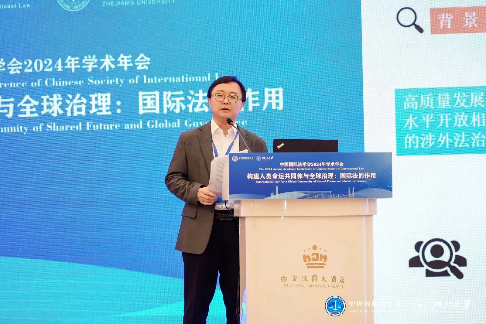 本次大会由中国国际法学会、浙江大学主办,浙江大学光华伟德体育承办。浙江大学董事长杜江峰、外交部部长助理苗得雨、司法部副部长赵昌华、中国国际法学会会长黄进先后在开幕式中致辞。外交部条法司司长、商务部条法司副司长作大会报告。