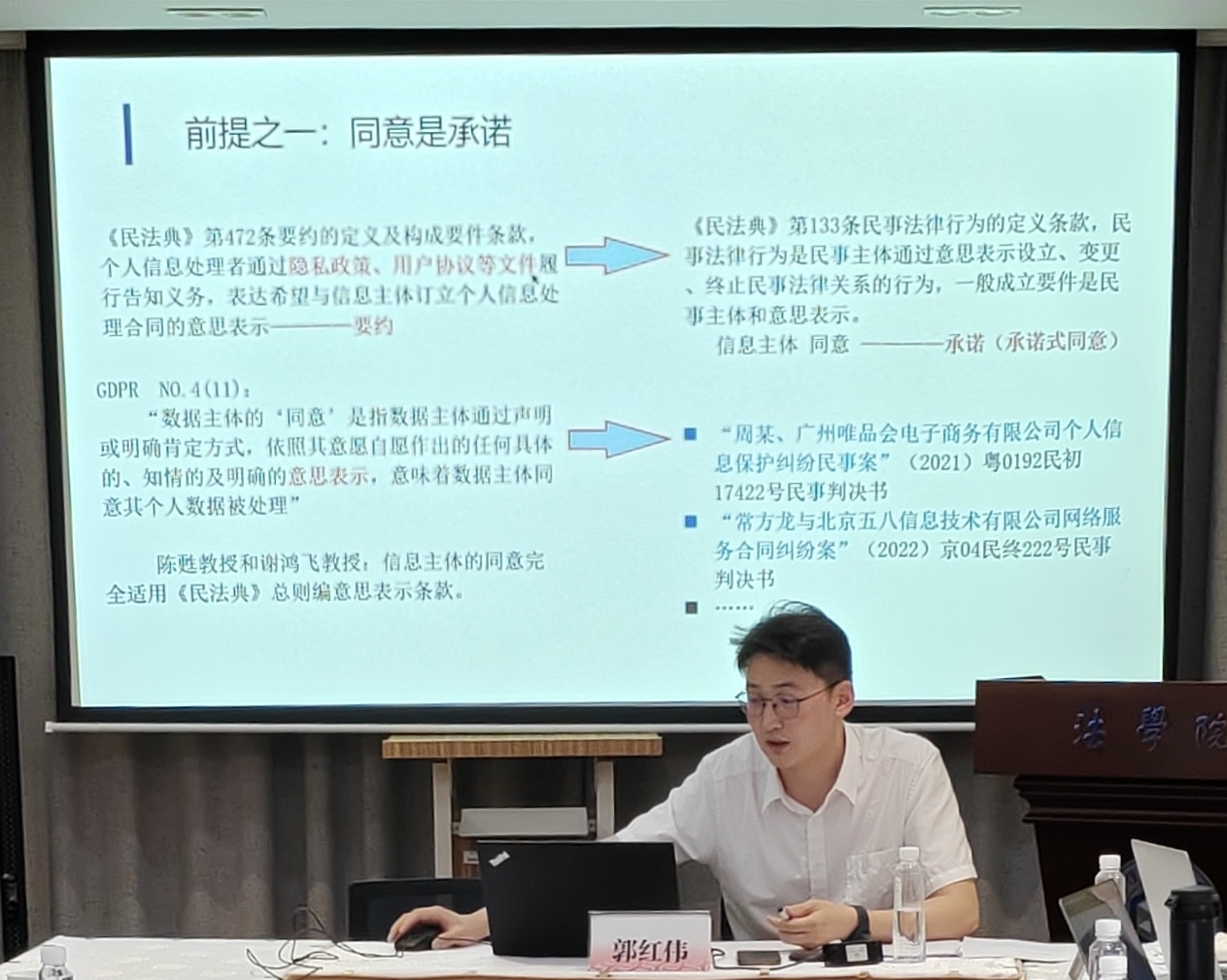 在与谈环节,谢雪凯对评议人的观点表示认可,认为郭红伟研究的主题具有较强的理论性,且行文涉及面很广,信息量很大,但作为基础理论研究,宜强化权利性质的界定等理论问题的分析与解决。熊静文从意思表示、同意的撤回、信息的删除等方面提出建议,如场景化考量损害的赔偿。苏今认为,理论上可以强化不同学说的对比,增强观点的说服力,建议在不同场景下考虑同意撤回的要件化,并构建具体的标准。