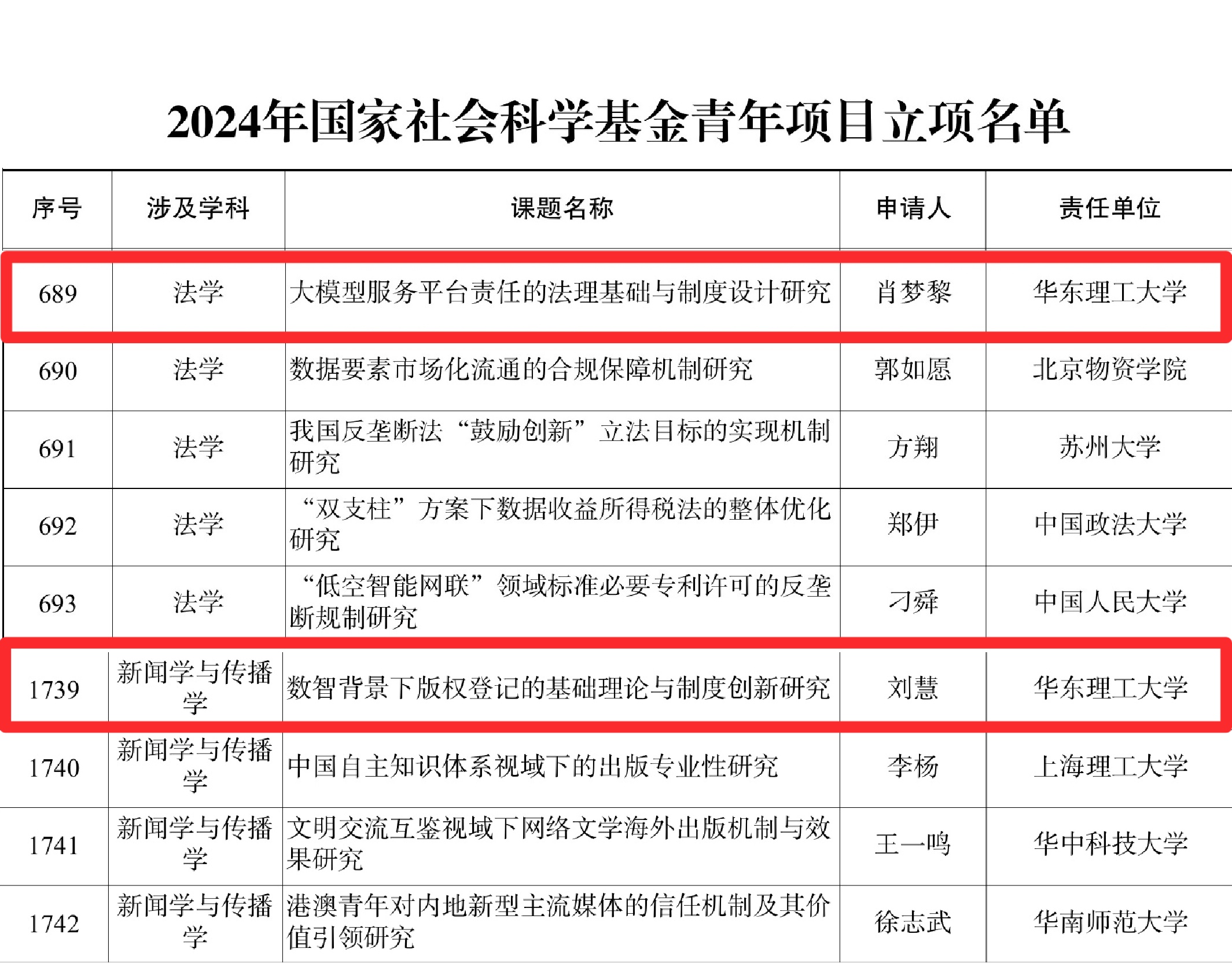9月14日,全国哲学社会科学工作办公室公示了2024年国家社会科学基金年度项目立项名单,公司肖梦黎老师申报的“大模型服务平台责任的法理基础与制度设计研究”与刘慧老师申报的“数智背景下版权登记的基础理论与制度创新研究”入选青年项目立项名单。项目的入选展现了伟德体育教师的学术实力,也体现了华理伟德体育在学术研究领域的影响力进一步增强。