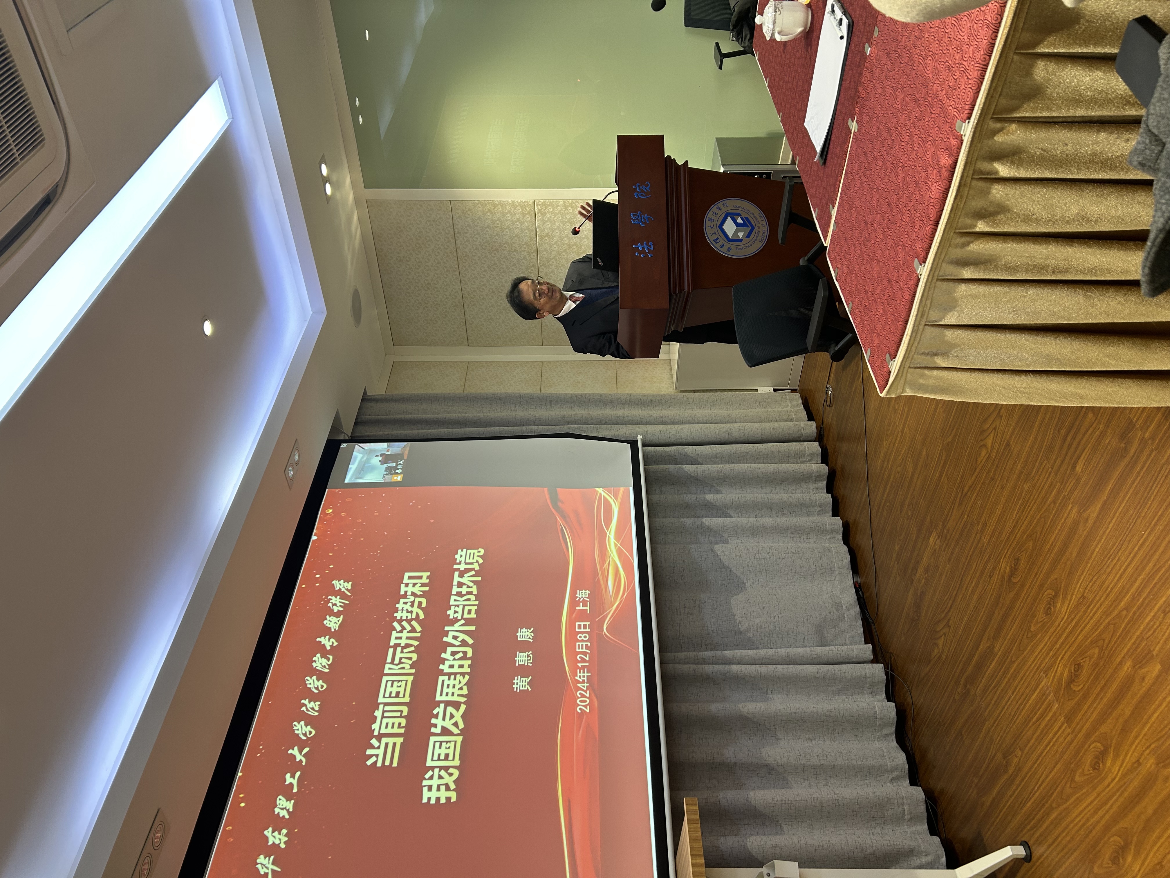 黄惠康从当前国际形势和我国发展的外部环境两个方面展开本次学术报告。他强调思考问题要把握好切入点,与时俱进,对时代有一个明确定位,对国家利益要有一个正确的把握。学会合作共赢,既要敢于斗争,又要善于斗争,所谓善于斗争就是要用好法律武器。
