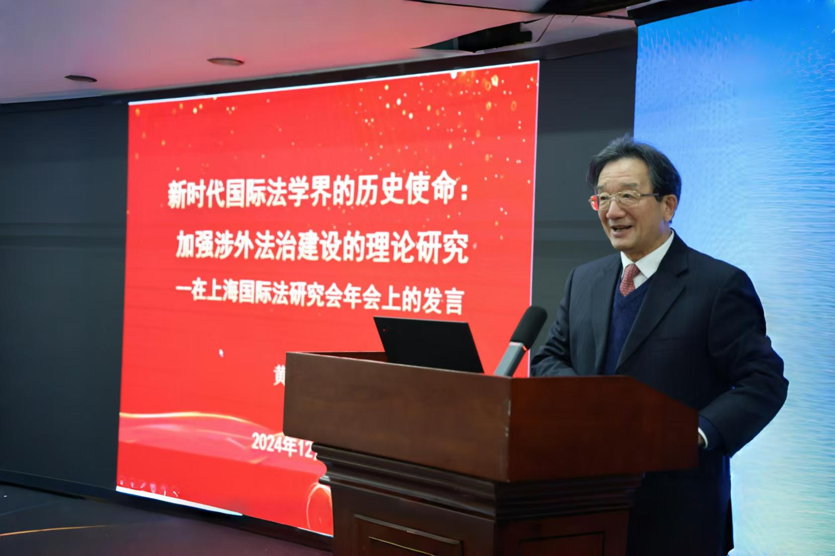 黄惠康以“当前国际法研究与运用热点及注意事项”为题为年会作主旨演讲。黄惠康从国际法理论研究、未来方向、方法论3个方面展开,分析了最近5年来涉外法治的建设情况,对涉外法治基础理论研究已取得的重要阶段性进展进行了介绍,并指出未来的涉外法治建设要从理论层面按照思想引领、理论探索、系统集成的思路推进,在实践层面要体现问题导向、需求牵引和行动落地的要求。