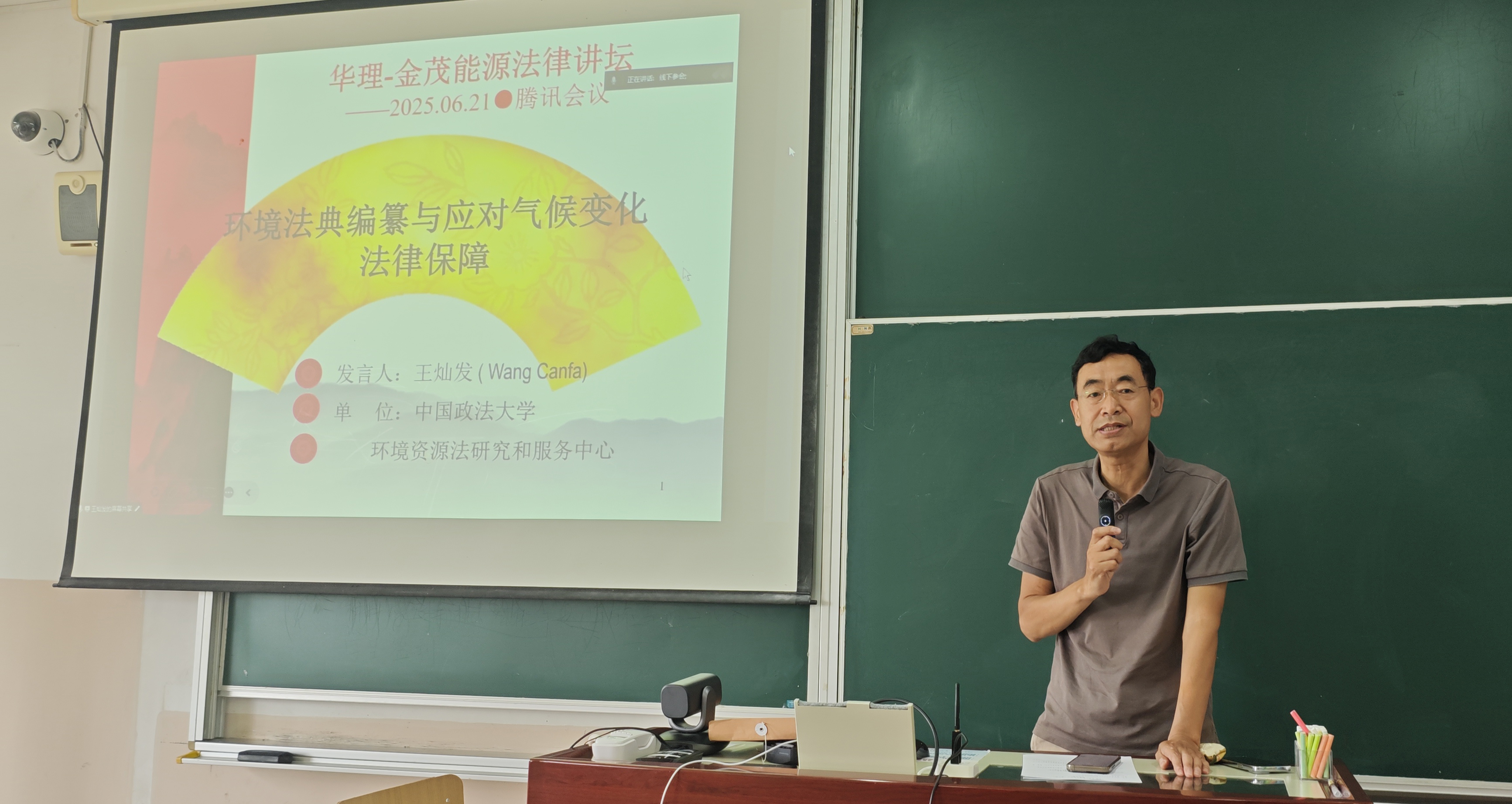 6月21日上午,由伟德体育与上海市金茂律师事务所联合主办、Bevictor伟德官网能源与资源环境法研究中心承办的华理-金茂能源法律讲坛第四期在徐汇校区研究生楼405顺利举行。本期讲坛以环境法典编纂与应对气候变化法治保障为主题,知名环境法学者、中国政法大学教授、博士生导师王灿发担任主讲嘉宾。伟德体育副经理孙晓东教授致辞,全国律协环境资源与能源专业委员会副主任、上海市金茂律师事务所合伙人吴荣良律师,金茂律师事务所青年律师黄启荣、李琳娜出席讲坛。线上线下共计100余人参与本期活动。伟德体育青年教师王雨彤博士主持本期讲坛。青年教师张婧作了会议总结。